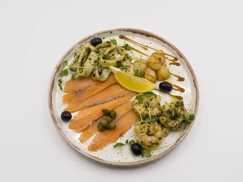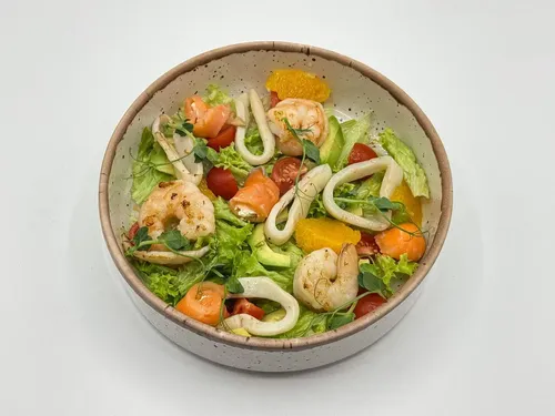 Сочетание различных морепродуктов в одном салате: обжареные креветки, кальмар и лосось собственного посола в виде рулетов с творожным сыром. Подается с листьями салата, помидорами черри, авокадо в легкой масленисто-цитросовой заправке.