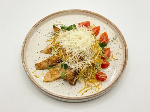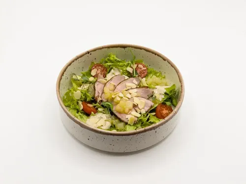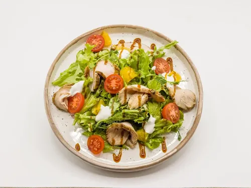 Обжаренная куриная грудка со свежими листьями салата, помидорами черри, сыром Пармезан и картофелем пай. Заправлен соусом айоли и зернистой горчицей.
