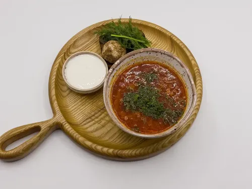 Фирменный борщ на говяжьем бульоне с уткой и говядиной. Подается с обжаренным ржаным тостом, хрустящим трюфелем из сала, сметаной и зеленью.