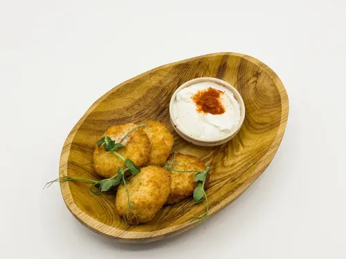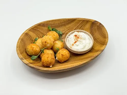 Хрустящие шарики из сыра сулугуни с добавлением обжаренного бекона. Подаются с соусом айоли.