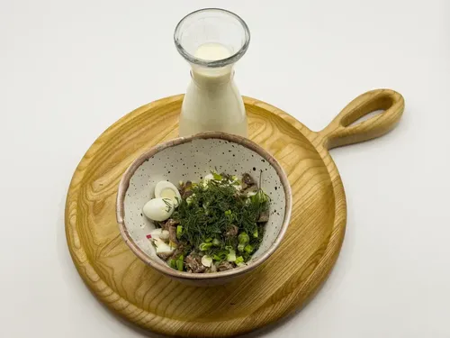 Классическая окрошка с говядиной, отварным картофелем, редисом и огурцом. Заправка готовится на кефире.