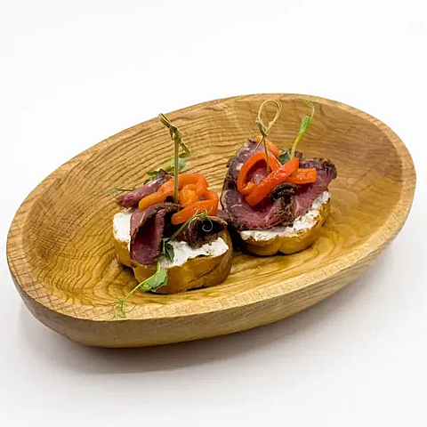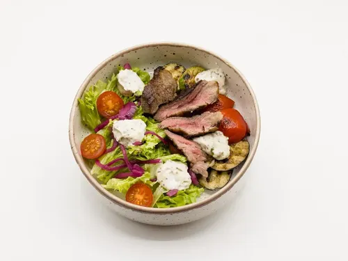 Мы используем нежнейший отруб тритип, прожарка по желанию. Свежесть придают листья салата и соус винегрет. Говядина подается на овощах гриль, вкус дополняет соус айоли и зернистая горчица.