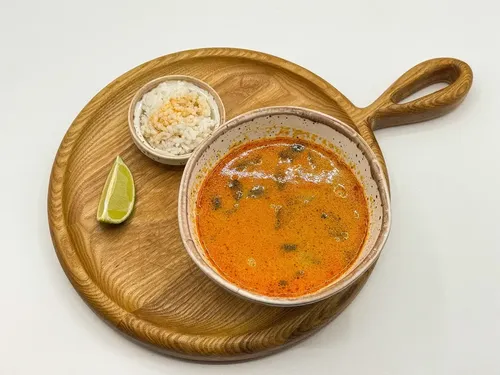 Острый тайский суп на основе кокосового молока и пасты том ям с креветками, кальмаром и грибным ассорти из шампиньонов и вешенок. Отдельно подается лайм и рис.
