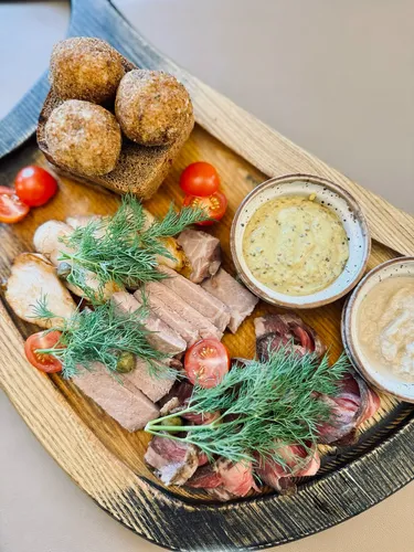 Нарезка из ростбифа, буженины, куриной грудки и трюфеля из сала. Подается с хреном и ржаными тостами.
