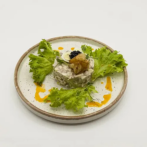 Необыкновенное сочетание разварной говядины и крабового мяса. В состав так же входит отварной картофель, яйца и свежий огурчик. Мы не используем горошек и морковь. Подаем с жаренной креветкой и икрой палтуса.
