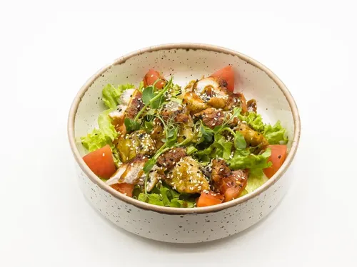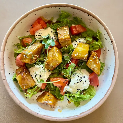 Салат с обжареными, хрустящим баклажанами, томатами и свежим сливочным сыром страчателла, дополнен соусом имбирный терияки.