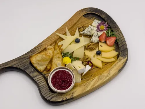Плато из камамбера, гойи, маасдама и сыра рокфорти. Дополняем брусничным соусом, медом и хрустящими тостами.