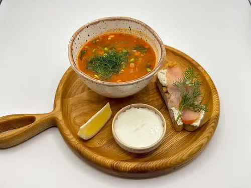 Насыщенная, мясная солянка, с копчеными свиными ребрышками, отварной свининой, варено-копченой куриной грудкой, соленым огурцом и капперсами. Подается с брускеттой из куриного карпаччо и сметаной.