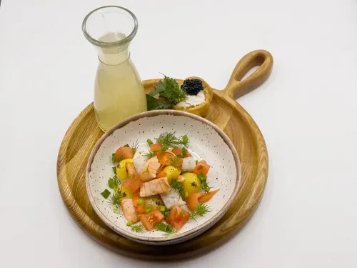 Лосось своего посола, кальмар, обжаренные гребешок и креветки. Подаются в холодном виде, слегка подмаринованные.