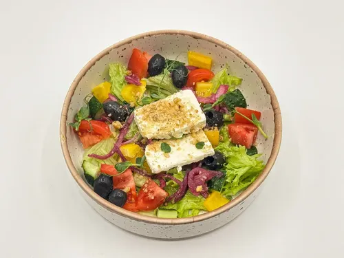Классический греческий салат с овощами, грецким орехом и сыром сиртаки. В состав входит: помидор, огурец, болгарский перец, маринованный лук, маслины.