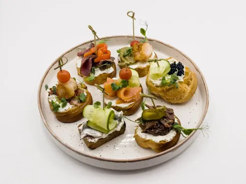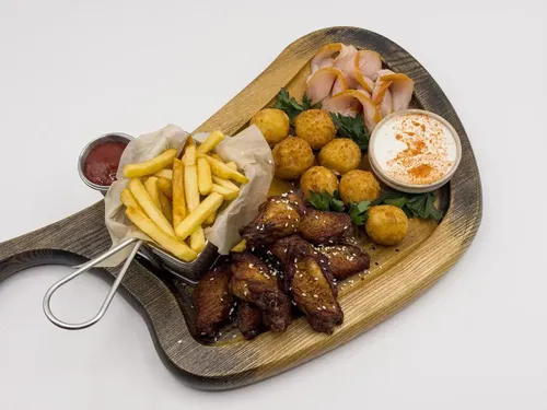 Ассорти из нескольких закусок: пряные куриные крылья в соевом соусе, сырные шарики с беконом, карпаччо из курицы и картофель фри. Подается с соусами айоли, кетчупом. Закуска для 3-4 человек.