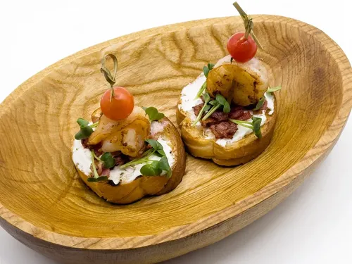 Два ломтика багета с сырным кремом, обжаренным беконом и креветкой.
