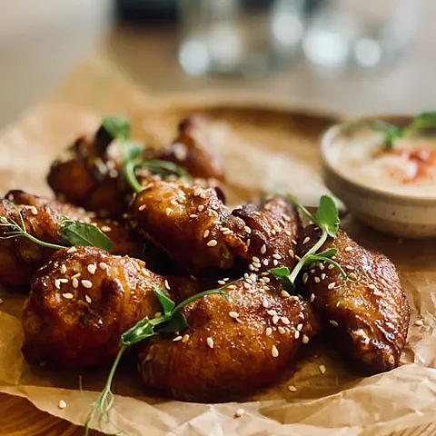 Пряные куриные крылышки в соусе барбекю, подаются с соусом айоли.