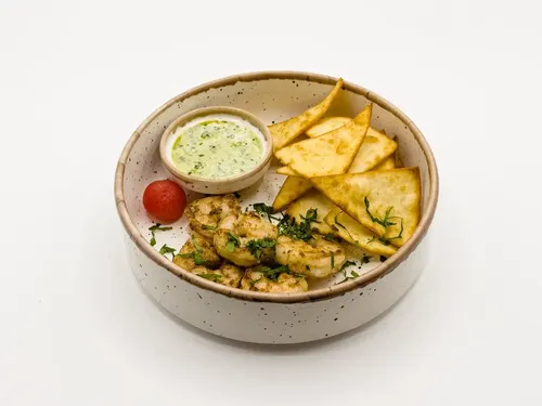 Креветки гриль подаются с соусом на основе белого чесночного соуса и песто, дополняем чипсами из тортильи.