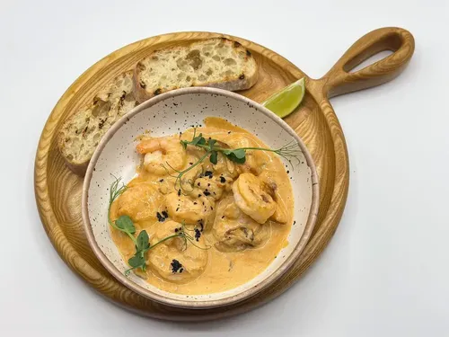 Обжаренные тигровые креветки с вешенками в соусе том ям. Подаются с гренками.