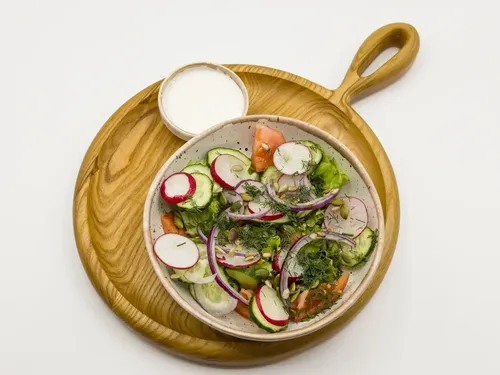 Салат со свежими огурцам, томатами, редисом, листями салата и обжареными семенами подсолнуха и тыквы. Подается со сметаной.