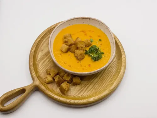 Суп-пюре из кабачка, болгарского перца, моркови и картофеля, сваренный на курином бульоне, подается с пшеничными гренками.