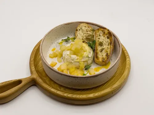 Горячая закуска из мягкого сыра камамбера с кремообразной сердцевиной и плотной корочкой из белой плесени. Подаем с хрустящей чиабаттой и грушевым чатни. Чатни готовится с добавлением корня имбиря и сока лимона.