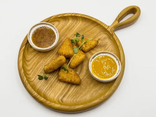 Сыр сулугуни в хрустящей панировке. Подается с двумя соусами : медовый чилли и облепиховый.