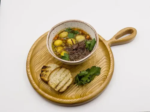 Насыщенный говяжий бульон с овощами (кабачок, перец, морковь и картофель), подается с разварной говядиной.