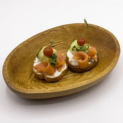 Два бутерброда на кружочках багета с сырным кремом и классическим сочетанием креветки и соуса из авокадо.