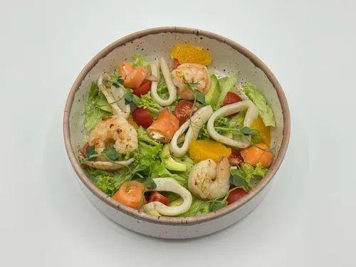 Сочетание различных морепродуктов в одном салате: обжареные креветки, кальмар и лосось собственного посола в виде рулетов с творожным сыром. Подается с листьями салата, помидорами черри, гуакамоле в легкой масленисто-цитросовой заправке.